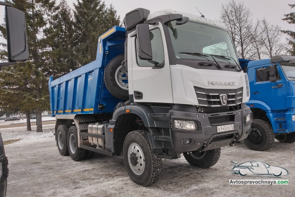 Ожидается, что новый самосвал получит обозначение КАМАЗ-6595. Как отмечает Avtospravochnaya.com, на выставке представлены сразу два варианта машины — стандартный (слева) и полноприводный (справа). Полноприводный можно отличить сразу — он более высокий.
