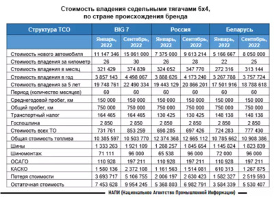 Маркетинговое агентство НАПИ проанализировало изменение стоимости владения новыми седельными тягачами в январе и сентябре 2022 года.
